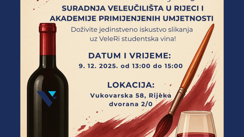 Pridružite nam se na jedinstvenom kreativnom događanju gdje se slika VeleRi vinom – originalnim studentskim vinom koje proizvode studenti Stručnog prijediplomskog studija Vinarstvo (Poreč) Veleučilišta u Rijeci – uz istovremenu degustaciju VeleRi studentskih vina.