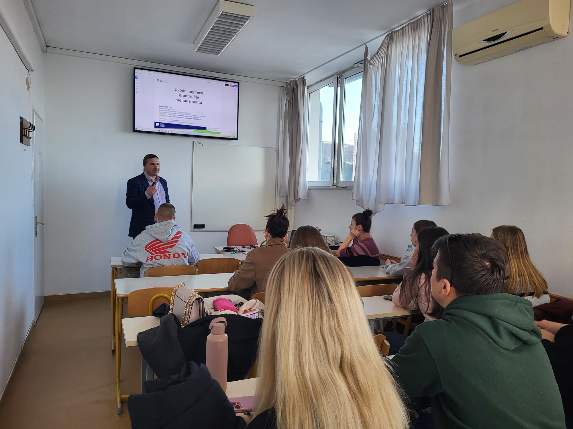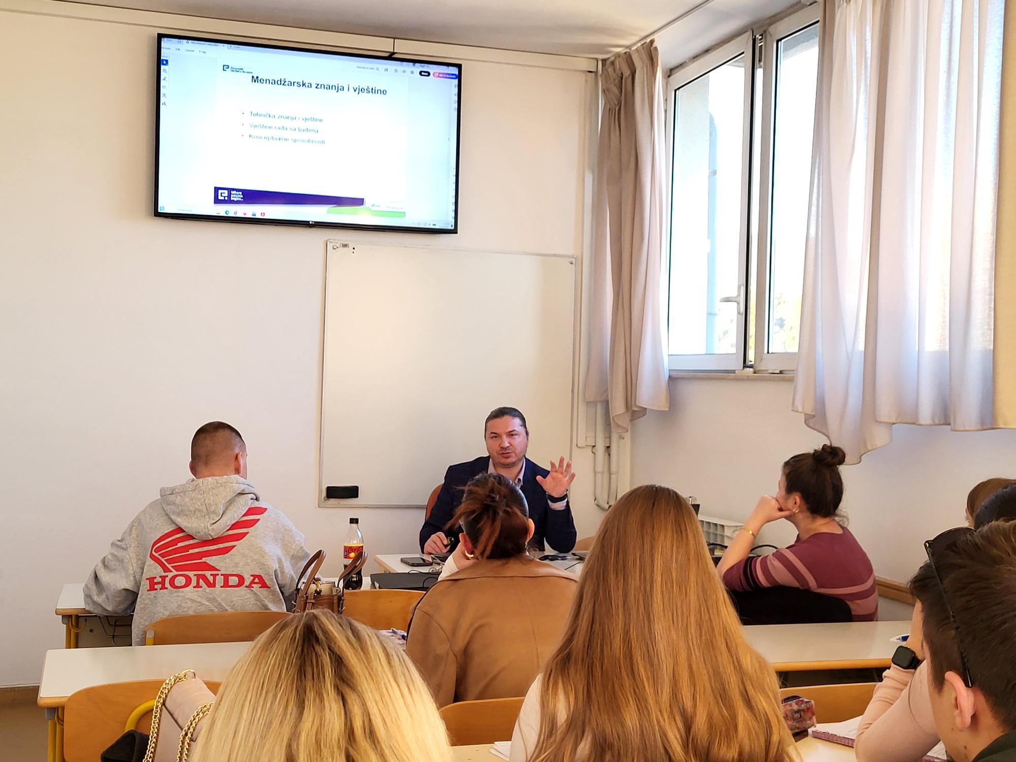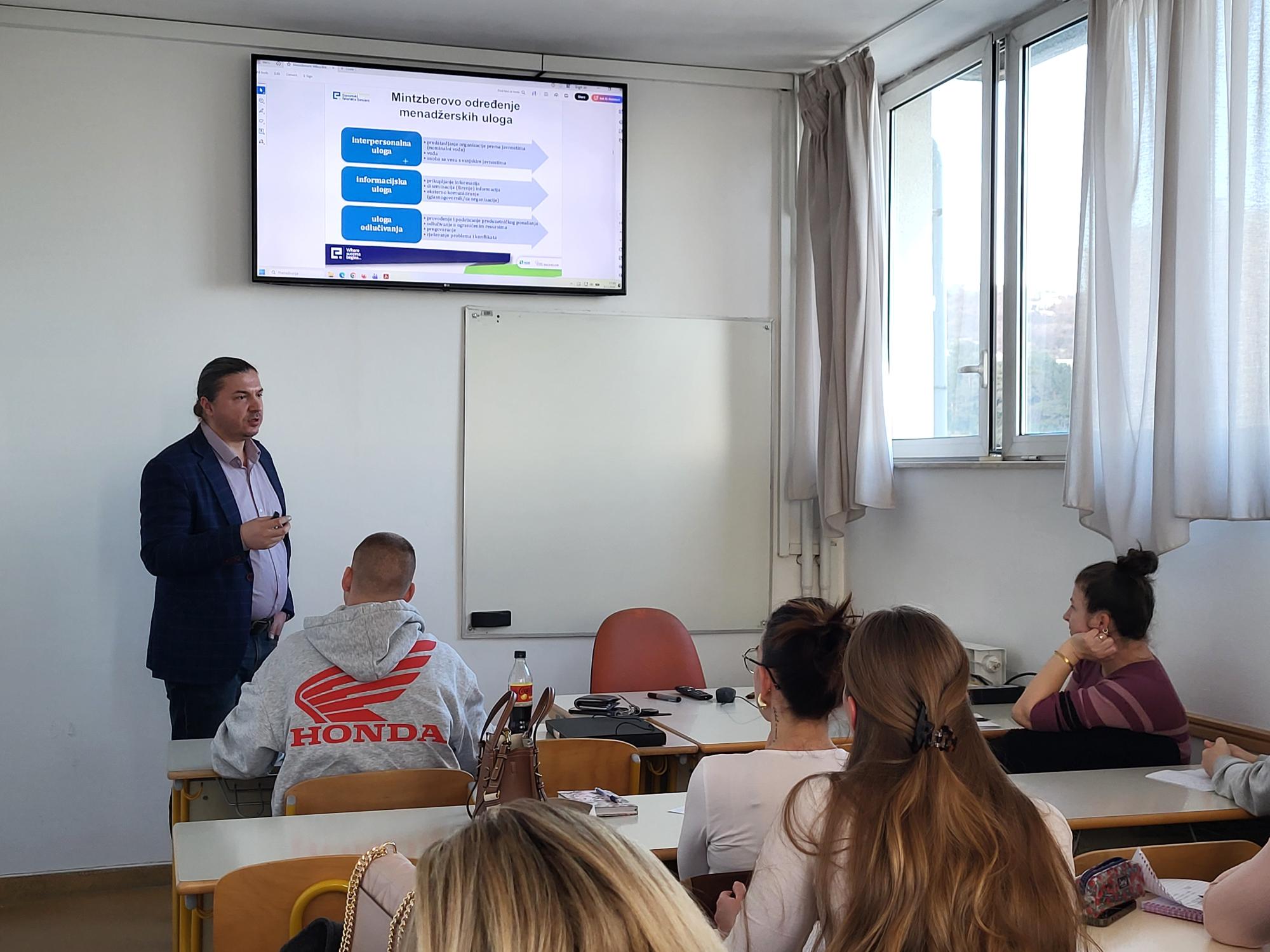 U sklopu Erasmus+ programa mobilnosti održano je 13. 3. 2026. gostujuće predavanje profesora dr. sc. Anesa Hrnjića s Ekonomskog fakulteta u Sarajevu namijenjeno studentima druge godine stručnog prijediplomskog studija Poduzetništvo u okviru kolegija Osnove menadžmenta. Tijekom predavanja obrađene su ključne teme iz područja menadžmenta, uključujući pojam menadžmenta, razliku između efikasnosti i efektivnosti, funkcije menadžmenta, uloge i razine menadžmenta te vještine potrebne za uspješno upravljanje.
